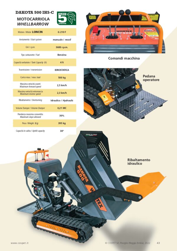 La motocarriola cingolata DAKOTA 500 IHS-C/H ,con motore Honda, idrostatica con capacità di 500 Kg di carico, ribaltamento idraulico con cassone Dumper e Pala Meccanica.